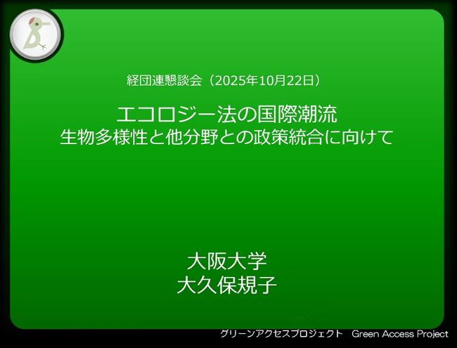 当日は、大阪大学大学院法学研究科の大久保規子(おおくぼ・のりこ)教授より「エコロジー法の国際潮流~生物多様性と他分野との政策統合に向けて~」と題してご説明をいただきました。大久保教授は、近年の国際的な潮流として、人間中心主義から生態系中心主義への転換があり、南米などの一部の地域においては、従来の人間を中心とした環境法から、生態系を中心に置いた政策統合をすべきであるとしたエコロジー法への進展の動きが見られる、と説明されました。そして、より漸進的なアプローチとして、持続可能な発展原則の法制化があり、ウェールズでの将来世代ウエルビーング法を制定、また、国連では「将来世代に関する国連システム共通原則」において、将来の世代に焦点を当てるということは、人類だけに焦点を当てるということではなく、生物多様性と天然資源を保護し、プラネタリー・バウンダリーを尊重する持続可能な発展に努める責任があるとしている、と発言されました。加えて、日本における生物多様性と他分野との政策統合に向けては、①基本法の改革、②持続可能性アセスメント・戦略的環境アセスメント等の評価制度の導入、③政策評価制度の改革、④予算・補助金の仕組みの改革、⑤生態系・自然を基礎とする機関の活用、⑥公益訴訟の活用等が論点となるとの見通しを示されました。